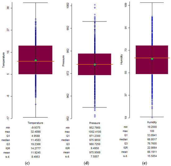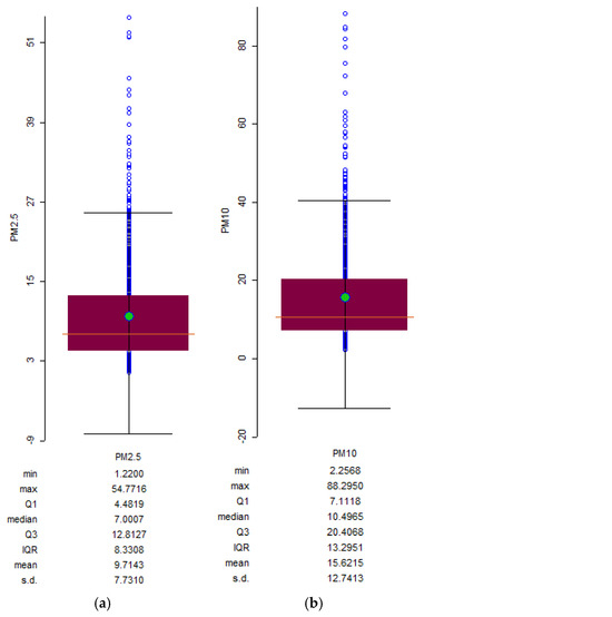 Regarding the collected data about the air quality indicators collected from sensors and the data about the descriptive statistics, these are presented for PM2.5, PM10 (daily mean calculated by the authors from initial collected data), temperature, humidity, and pressure in Table 11. In Figure 10a–e, the box plots are illustrated for these variables. According to the one sample from the Kolmogorov–Smirnov test, none of these continuous variables have a normal distribution of values for the analyzed time period.
