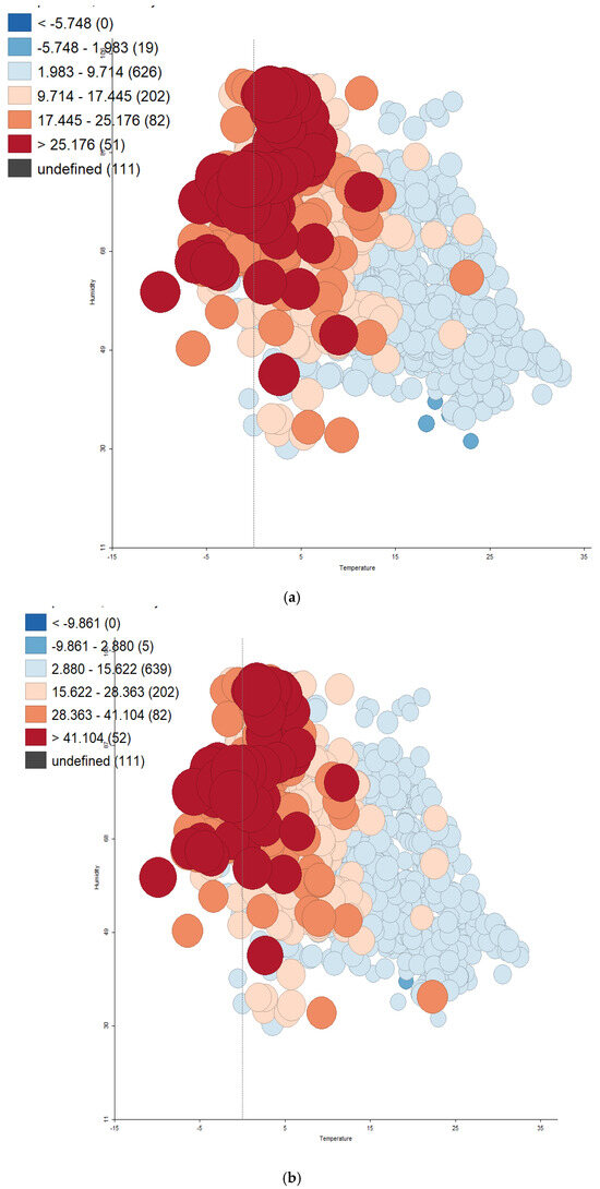 Distribution of the values on bidimensional spatial of temperature (X-axis) and humidity (Y-axis): (a) PM2.5 [µg/m3]; (b) PM10 [µg/m3].
