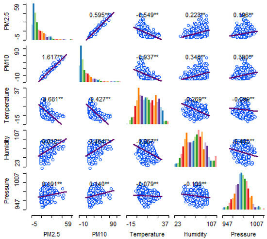 Scatter plot matrices for PM2.5 [µg/m3] and PM10 [µg/m3] according to weather characteristics: temperature [°C], pressure [hPa], and humidity [%]. ** means Statistically significant for p_value < 0.05.