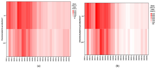 Heat map: (a) PM2.5 values [µg/m3] during chemical plant production and stop periods; (b) PM10 values [µg/m3] during chemical plant production and stop periods.