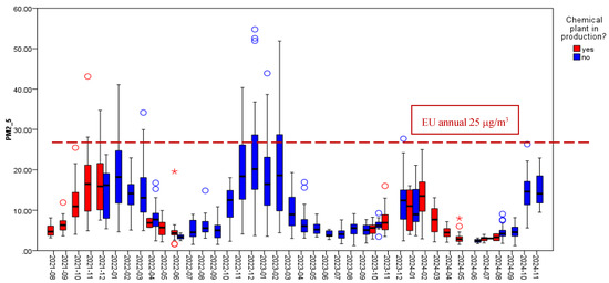 Box plots for PM2.5 comparatively for production and stops of the chemical plant and EU standard.