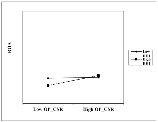 Table 3 and Table 4 report results of the main analyses, contingent on two different dependent variables. Firstly, in Table 3, the results of the main analyses using Tobin’s q as a dependent variable are presented. In the first column without an interaction term, both OP_CSR and NOP_CSR show an insignificant impact on Tobin’s q. For the moderating effect of the concentration of institutional ownership (INST_HHI), consistent with our speculation, we found that while INST_HHI has an insignificant moderating effect on the relationship between NOP_CSR and Tobin’s q, it has a positive and significant moderating effect in the case of OP_CSR, supporting H1 (β = 3.080, p < 0.05; See Figure 1). That is, the interaction (i.e., OP_CSR × INST_HHI) showed a significant effect on Tobin’s q, implying that restaurant firms with a high concentration of institutional ownership are more likely to achieve better financial performance measured by Tobin’s q when undertaking operation-related CSR initiatives. Secondly, to check the robustness of our main results, we additionally estimated coefficients with ROA as another dependent variable. In Table 4, we found a positive moderating effect of INST_HHI on the relationship between OP_CSR and ROA, supporting H1 (β = 0.149, p < 0.05; See Figure 2), while the interaction between INST_HHI and NOP_CSR showed an insignificant effect on ROA. In other words, INST_HHI positively moderated the relationship between OP_CSR and firm performance measured by Tobin’s q and ROA. However, a coefficient of the interaction term between INST_HHI and NOP_CSR indicated an insignificant impact on financial performance in both cases, suggesting that the concentration of institutional ownership did not function as an important factor in enhancing the financial consequences of non-operation-related CSR activities. Therefore, H2 was rejected.