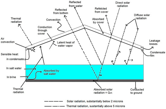 Figure 1 details the energy flows in a solar still, illustrating how heat transport affects the glass cover, black tray, water mass, and insulation [18].