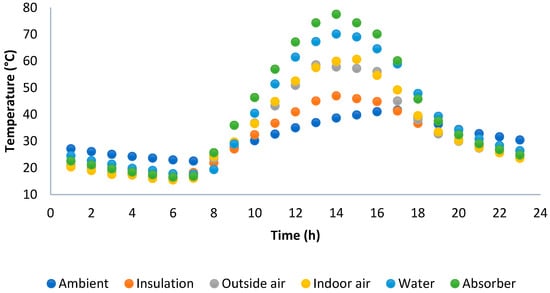 - Black Tray Absorber: this reached a peak temperature of 77.5 °C, transferring heat efficiently to the water.