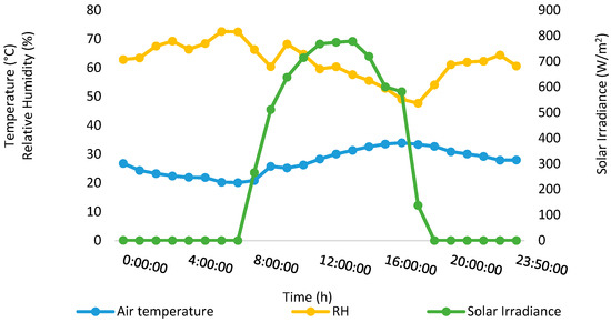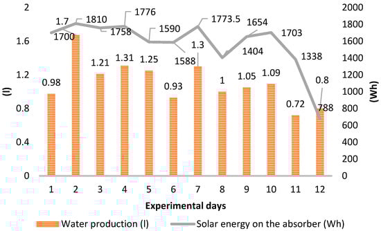 By analyzing the temperature profiles, it becomes evident that maintaining optimal temperature conditions is vital to maximizing the efficiency of the solar distillation process. Efficient systems achieve a stable and high temperature in the absorber tray while facilitating effective heat transfer and minimizing losses [19]. Table 2 presents the hourly variations in temperature and solar irradiance, illustrating the thermal behavior of the solar still during a typical day of operation.