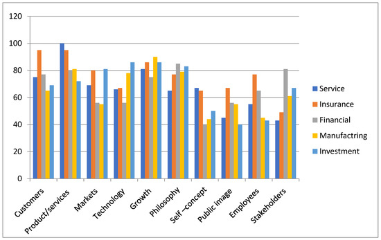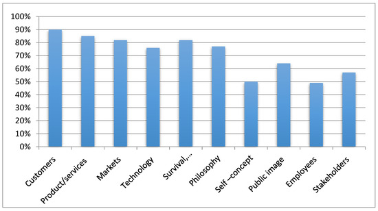 Figure 4 provides an illustration of a percentage of companies that have integrated various components into their mission statements, in line with the Environmental, Social, and Governance (ESG) criteria. Many companies prefer their customers, with a majority of 90% placing a strong emphasis on them. Additionally, 85% of companies focus on their products and services, indicating a dedication to ensuring customer satisfaction and maintaining high product quality. These values match with the social dimension of ESG, which emphasizes consumer protection and product responsibility [16,53]. Approximately 82% of companies prioritize markets, indicating a strong emphasis on strategic market positioning and competitive behavior. This focus is crucial for ensuring transparency in governance and promoting fair competition [46]. With 76% of companies accepting technology, it is clear that they are committed to environmental innovations that focus on reducing pollution and improving resource efficiency, which are crucial for long-term sustainability [40]. In a similar vein, it is worth noting that 82% of companies prioritize survival, growth, and profitability. This demonstrates their commitment to financial sustainability and effective management practices, which are crucial for maintaining good governance [9,13,48]. Philosophy and self-concept, commonly discussed by many companies, play a crucial role in shaping culture, ethics, and compliance within an organization [16]. Nevertheless, the relatively lower importance placed on public image (64%), employees (49%), and stakeholders (57%) implies that these aspects may not be given as much priority in mission statements. This could indicate potential shortcomings in addressing comprehensive ESG strategies, particularly in terms of engaging internal stakeholders and fostering public trust. Overall, it is worth noting the strong focus on customer orientation and market competitiveness. However, there is an opportunity for improvement in terms of considering environmental factors and engaging with a wider range of stakeholders. This would help correspond mission statements with broader ESG objectives.