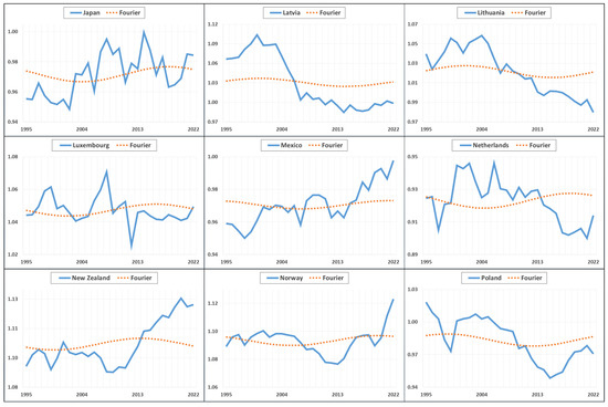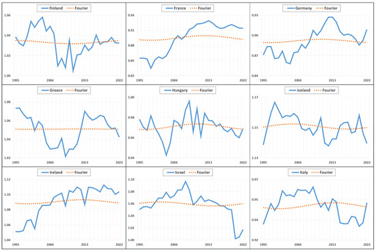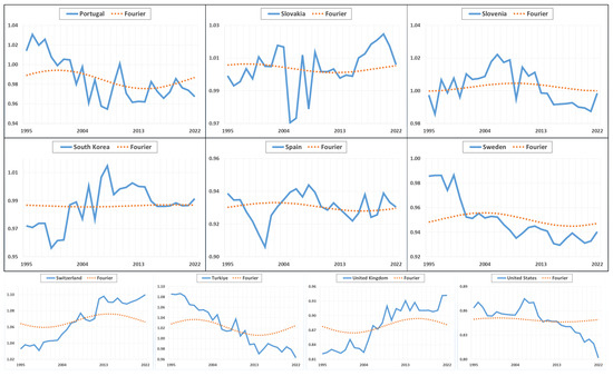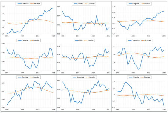In the analysis methods to be used in the study, methods enriched with Fourier expansion were preferred in order to better detect structural breaks and dynamic patterns of variables over time. The Fourier expansion is frequently used in the literature as a powerful method to detect structural breaks and gradual changes in time series. While traditional unit root tests and panel data analysis methods often fail to adequately capture abrupt breaks or nonlinear movements, the Fourier expansion offered the ability to model complex fluctuations and periodic patterns in the data. The main rationale for using the Fourier expansion in this study was the assumption that changes in the export diversification processes of OECD countries may have been shaped not only by abrupt transformations but also by gradual transitions over time. The results obtained with the Fourier expansion provided a more flexible and realistic analysis compared to traditional methods, allowing for a more precise analysis of the dynamics of convergence and divergence in export diversification. Figure 1 presents the graphical representation of the variables together with the Fourier expansion to visually support why this method is preferred.