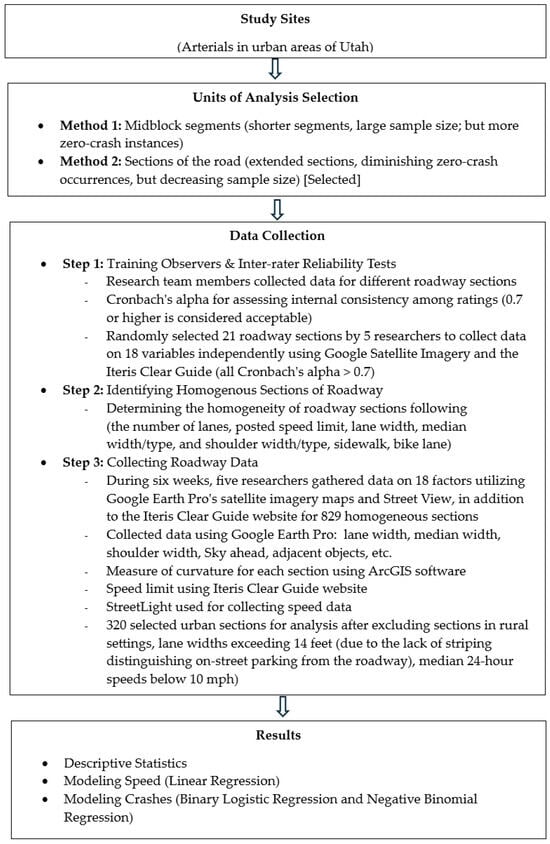 This paper is organized as follows: Section 2 provides a detailed review of the relevant literature on lane width, speed, and crash rates, highlighting existing gaps in research. Section 3 outlines the methodology used for data collection and analysis, including the selection of urban arterial sections in Utah and the variables considered in the study. Section 4 presents the results of the analysis, including statistical relationships between lane width, speed, and crash rates, and discusses the findings in the context of road safety. Finally, Section 5 concludes the study by summarizing key insights and suggesting directions for future research.