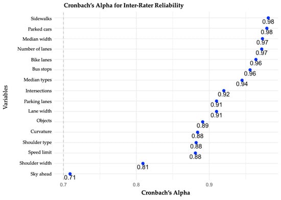 Twenty-one roadway sections were randomly selected from the total sample pool, and five researchers independently collected data on 18 variables for these sections. After two weeks of data collection using Google Satellite Imagery and the Iteris Clear Guide, the statistical analysis showed Cronbach’s alpha values of 0.7 or higher for all 18 variables, confirming strong consistency in the ratings (see Figure 3). As a result, the pilot test validated that the raters could proceed independently with the data collection for the entire sample, following the established protocol.