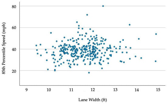 The effect of narrower travel lanes on safety remains contentious, as research presents inconclusive results about the consistent enhancement of road safety through narrower lane widths. An initial study by Swift et al. (1997) indicated that narrower lanes on residential streets were associated with reduced injury-related accidents [5]. Recent studies suggest that the safety implications of narrower lanes can differ based on the traffic volume and roadway type. Narrow lanes have been shown to enhance safety on rural roads, but on urban arterial roads, they are frequently associated with an increased risk of collisions [6,7,8,9]. In particular, the relationship between lane width and driving speeds is complex and not entirely understood. There is a dearth of research on the subject, largely due to lack of speed data for large samples of urban roadways.