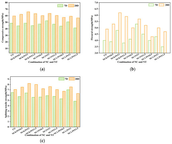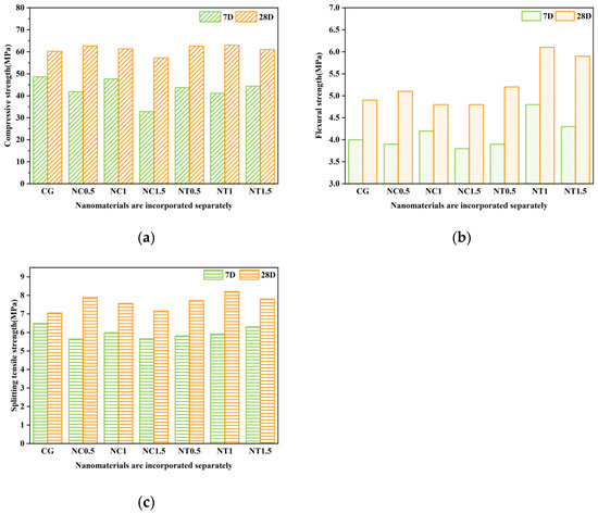 The mechanical properties of concrete at 7 and 28 days when NC and NT are added separately. ((a) Compressive strength; (b) flexural strength; (c) splitting tensile strength).