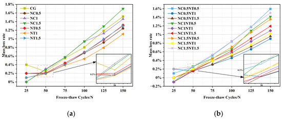 Mass loss rate of concrete after freeze–thaw cycles. ((a) NC and NT were added separately; (b) NC and NT composite incorporation).