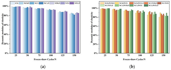 Dynamic elastic modulus of concrete after freeze–thaw cycles. ((a) NC and NT were added separately; (b) NC and NT composite incorporation).