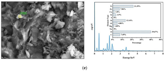 Figure 8 shows the high magnification morphology and elemental composition of CG, NC0.5, NC0.5NT0.5, NC0.5NT1, and NC0.5NT1.5 for 28 days of standard maintenance. EDS was used to detect the elemental content of the hydration products predominantly present in the SEM images, and the changes in the elemental content reflected the results of the changes in the microstructure [51,52]. From Figure 8a, it can be seen that the microstructure of the CG group is loose, with more cavities under standard conditions. The microstructure of the specimen containing 0.5% NC was significantly denser, and the fine size of NC increased the number of surface atoms, surface area, and surface area energy, which resulted in more C-S-H gel adsorbed on the surface of the particles. The new three-dimensional network structure with NC as the core and bonding synthesis strengthens the interfacial layer between steel fibers and cementitious materials, leading to enhanced mechanical properties and durability of concrete [32]. When NT was used to replace cement at 1%, a dense microstructure appeared in the concrete samples at 28 d, along with a large number of flocculated gel products. The C-S-H gel structure grew into a spherical shape with better stability, and the hydration products of the C-S-H gel structure grew to a more stable spherical shape, and the hydration products were more complete, fine, and uniformly distributed, and the pores were significantly reduced [53]. Observation of Figure 8e reveals the presence of equilateral prisms or thin slabs of CH, O and I-type C-S-H gels and a large number of hexagonal lamellar hydration products AFm in the microstructure. According to spectroscopic study, as the quantity of NT substitution increases, the content of the Al element tends to rise and subsequently fall. The Al-containing oxides can participate in the secondary hydration reaction during hydration and affect the microstructure and durability properties of cementite.