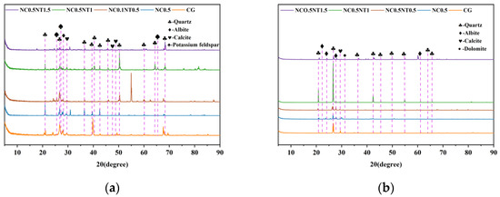 To discuss the effect of different NT contents on the mineralogical composition of SFRC, five specimens, CG, NC0.5, NC0.5NT0.5, NC0.5NT1, and NC0.5NT1.5, were subjected to XRD tests, and in Figure 9, the results are displayed. The combined SEM and XRD analysis results show that NC does not affect the hydration composition of cement. Rather, its micro aggregate and surface effects promote the production of hydration products C-S-H, which improves the enrichment and directional arrangement properties of interfacial CH from near-planar to spatial arrangement, leading to enhanced mechanical properties of the structure [44,54]. The amount of NT doping affects the peak value of the minerals. The higher the peak, the higher the amount of mineral crystallization [55]. The mineral composition of the five specimens after 7 and 28 days of standard curing remained the same, dominated by quartz, sodium feldspar, and calcite. In the early stage of hydration, calcite can be used as an inert filler to fill the voids between cement particles [56]. From Figure 9a, it can be seen that the addition of 0.5% NC increases the quartz content compared to CG. However, as the NT content increases, the quartz content first increases and then decreases, while the calcite content decreases. In the cement hydration environment, NT has a strong adsorption capacity for Ca2+, affecting the concentration of Ca(OH)2 in the concrete matrix. The reaction of Ca(OH)2 with CO2 produces calcite, and NT changes the amount of Ca(OH)2, which in turn indirectly affects the amount of calcite produced. The adsorption and desorption processes on the quartz surface may be affected by changes in the chemical environment, which in turn can influence the state of quartz and subsequently affect its final content in the hydration products. The specimens maintained for 7 days contained a certain amount of potassium feldspar in addition to quartz, sodium feldspar, and calcite. However, potassium feldspar is only present in the samples with added NC and NT, and the content of potassium feldspar in CG and NC0.5 is almost 0. The content of potassium feldspar gradually decreases with the increase in NT replacement. Figure 9b shows that the content of quartz in NC0.5NT1 increases substantially with the increase of the curing time, while the content of calcite decreases gradually. The crystal structure can affect the hydration reaction rate of cement. The planar structure of calcite is mainly composed of Ca and O atoms, similar to the CaO layers in C-S-H gel. Therefore, calcite can participate in the reaction of calcium carbonate and tricalcium aluminate (C3A), significantly accelerating the hydration process [57].