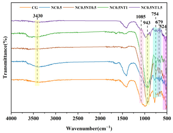 The changes in the absorption peaks of CG, NC0.5, and NC0.5NT after 28 days of standard curing determined according to FT-IR are shown in Figure 10. The analysis results indicate that the changes in the NT substitution amount can alter the ratio and vibration conditions of the functional groups. The stretching vibration of O-H is represented by the absorption peak at 3430 cm−1, The O-H functional groups in water can provide free H+ for the hydration reaction of concrete, accelerating the cement hydration process [58]. At 1085 cm−1, Si-O-Si undergoes an antisymmetric stretching vibration. The fundamental structural unit of the silicate skeleton is the Si-O-Si link, and the composition of the silicate skeleton has a direct impact on the fundamental characteristics of the gel. The Si-O-Si bond can release Si-OH through hydrolysis reactions with alkali activators, and Si-OH can condense with Ca2+ to form C-S-H gel [53,59]. The antisymmetric telescopic vibration absorption peak of Si-O is 943 cm−1, and 754 cm−1 is the symmetric telescopic vibration absorption peak of Si-O. The Si-O bond is formed between silicon atoms through covalent bonds during the gel formation process. It is a crucial component of condensation reactions and the most widely employed chemical bond in silicates and C-S-H gels. With the NT substitution amount increasing, the absorption peak of Si-O in the sample first decreases and then increases, and the degree of Si-O tetrahedra polymerization in the C-S-H gel progressively rises [60]. The stretching vibration absorption peak of O-M (M being a metal element) is 679–523 cm−1.
