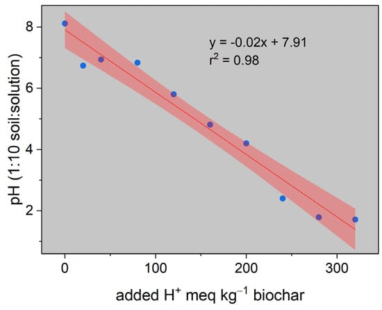 Biochar material was obtained from wood waste by gasification (>700 °C) process. The basic properties of biochar are 9.45 of pH, 0.30 dS m−1 of EC, 25.25 cmol kg−1 of CEC, 1.64 g kg−1 of total N, 0.20 g kg−1 of total P and 0.9 g kg−1 of exchangeable K. In order to obtain an acidic biochar with a pH value of 4.00 ± 0.25, different concentrations of H2SO4 and biochar material were mixed in a ratio of 1:1. For this purpose, solutions containing 20, 40, 80, 120, 160, 200, 240, 280, 320 meq H+ were added to the 1 kg biochar (Figure 1). After the biochar materials were dried in an oven until they reached a constant weight, pH readings were carried out in a 1:10 biochar:distilled water mixture. The aged biochar properties are 3.98 of pH, 4.38 dS m−1 of EC, 37.09 cmol kg−1 of CEC, 1.11 g kg−1 of total N, 0.59 g kg−1 of plant-available P and 1.41 g kg−1 of exchangeable K.