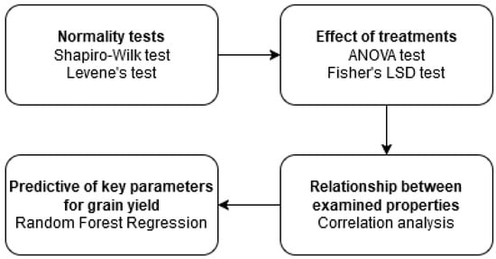 The methods used in the statistical analysis of the data obtained in the study are given in a flowchart (Figure 2). The normality and homogeneity of variance were checked by the Shapiro–Wilk and Levene’s test (p > 0.05) before statistical analysis. One-way analysis of variance (ANOVA) was performed via OriginPro to identify the effect of treatments on soil quality and plant growth. The Fisher’s LSD test was applied when there were statistically significant differences among the means (p < 0.05). The Pearson’s correlations between soil properties and yield-related parameters were performed by RStudio with “GGally” package. Random Forest Regression (RFR) is an ensemble technique that merges multiple decision trees to deliver more accurate and dependable predictive models. In this study, Python 3.8 was chosen as the primary programming language, with Anaconda3 serving as the development environment and Spyder 5.2.2 as the code editor for model training and evaluation (with a 0.2 test set split). Additionally, the RFR model was trained using Python’s built-in default parameters.
