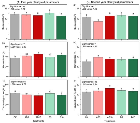 The harvest index was increased by all treatments compared to the CK in both years. The highest increase in the first year was observed with the AB10 treatment, showing an 18% increase (Figure 3c), while in the second year, the AB5 treatment resulted in the highest increase, reaching 30% (Figure 3d). In the first year, the highest thousand grain weight was observed in the CK treatment, while in the second year, it was found in the AB10 treatment (Figure 3e,f). However, no statistically significant differences were detected among the treatments in either year.