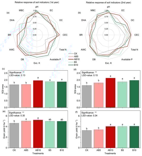 In both years, the effects of the treatments on the soil quality index area (SQI-area) were found to be statistically significant, with the AB10 treatment achieving the highest SQI-area values. The AB10 treatment increased the SQI-area by 19% compared to the CK in the first year and by 33% in the second year (Figure 4c,d). In both years, the effects of the treatments on the grain yield were found to be statistically significant, with all treatments increasing grain yield compared to the CK. In the first year, the highest grain yield was obtained from the AB10 treatment, reaching 5.25 t ha−1, which was 13% higher than the CK (Figure 4e). In the second year, the highest yield was obtained from the B10 treatment, reaching 4.09 t ha−1, which was 24% higher than the CK (Figure 4f).