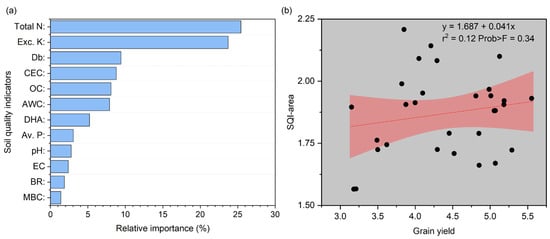 Random forest model predicting the key factors affecting soil quality area (a) and the relationship between SQI-area and grain yield (b).