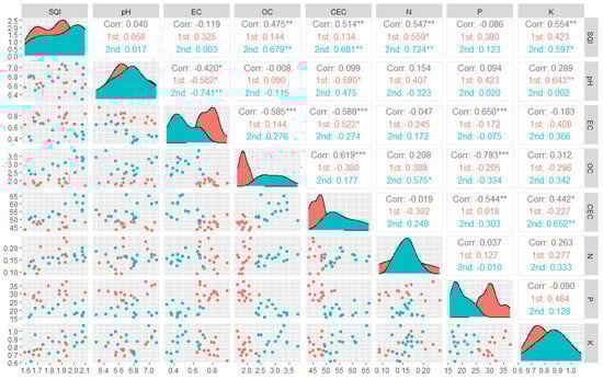 The correlation matrix between soil chemical properties, nutrients, and soil quality index (red color figures—first year, blue color figures—second year and gray color figures—both years). ***: p < 0.001, **: p < 0.01, *: p < 0.05, and ns: non-significant.