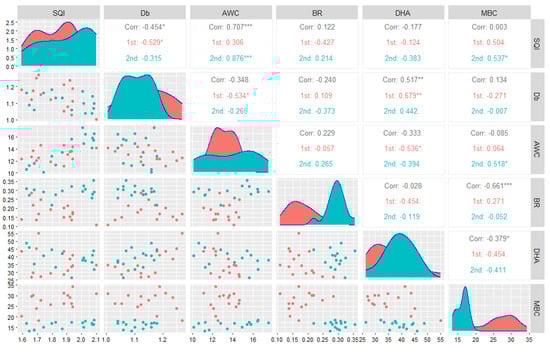 The correlation matrix between soil physical and biological properties and soil quality index (red color figures—first year, blue color figures—second year, and gray color figures—both years). ***: p < 0.001, **: p < 0.01, *: p < 0.05, and ns: non-significant.