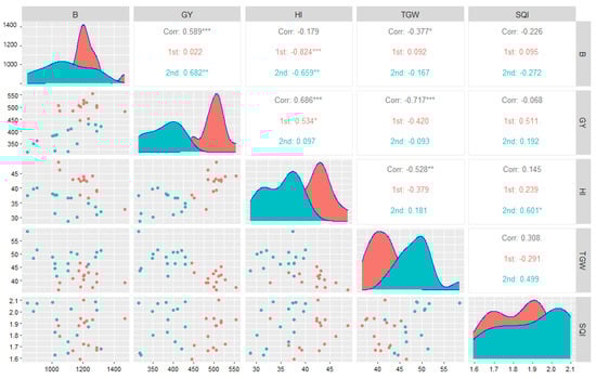 The correlation matrix between soil quality index, grain yield, and yield-related parameters (red color figures—first year, blue color figures—second year, and gray color figures—both years). ***: p < 0.001, **: p < 0.01, *: p < 0.05, and ns: non-significant.