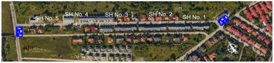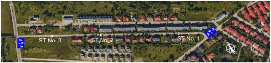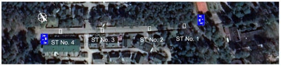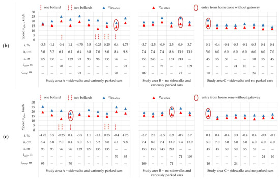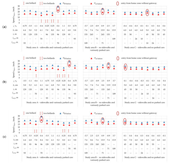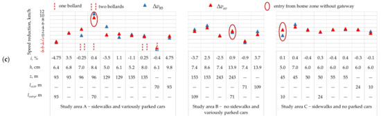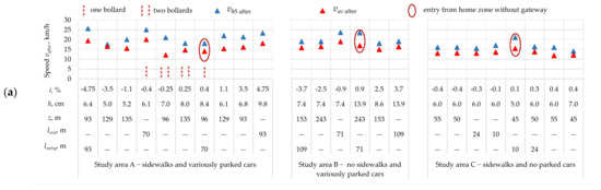 - Distance from the entry point to the first hump or distance from the last hump to the end of the street (study area A—speed hump No. 1 at 70 m and speed hump No. 5—93 m; study area B—speed table No. 1 at 71 m and speed table No. 3—109 m; study area C—speed table No. 1 at 10 m and speed table No. 4—24 m);