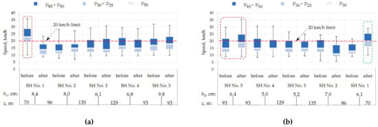 | Speed Parameters, km/h | Street Parameters or Hump Geometric Parameters | ||||