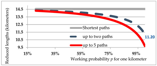 - The reliability logarithm and reduced risk exposure of an origin–destination pair. The absolute value of the reliability logarithm of an origin–destination pair is equal to the Shannon information of the event that “the origin–destination pair is connected”. It is also equal to the product of the failure rate and the risk exposure. As the existence of alternative paths reduces uncertainty, risk exposure decreases and is therefore less than the length of the shortest path. We call this reduced exposure the “reduced length” of the origin–destination pair. This highlights the gain provided by alternative paths as a reduction in length.