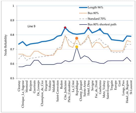 We calculated the network reliability and the normalized decrease in connected ODs in eleven cases (each time closing a node on line #9) and plotted both curves on Figure A3. The decreases in reliability and in the normalized number of connected OD seem to be roughly proportional, sometimes drastically so when a very important node is closed.