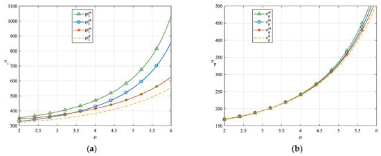 (a) The impact of demand sensitivity coefficient μ on the LSI’s profit. (b) The impact of demand sensitivity coefficient μ on the LSP’s profit.