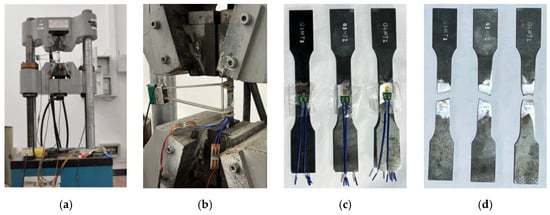 Uniaxial tensile test: testing machine (a) and specimens during (b), before (c), and after (d) the test.