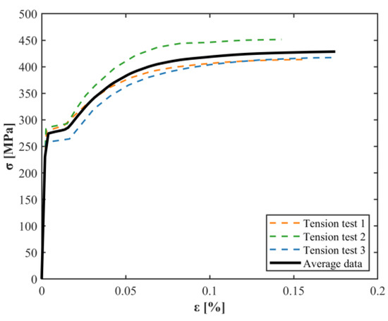 Uniaxial tensile tests were performed to evaluate the properties of the steel material according to ISO 6892 [36]. Three dog-bone specimens of steel were tested in a uniaxial tensile testing machine. The tests were performed in a displacement-controlled manner, and the load were monitored by load cells. By increasing the load, as expected, the specimen started to deform elastically, then exhibiting plastic deformation, late necking, and ultimately fracturing (Figure 1). The strain measurements presented here were obtained using the clamped extensometer device shown in Figure 1b, while strain gauges (Figure 1c) were employed in selected tests for validation purposes. The obtained stress (σ)—strain (ε) curves are shown in Figure 2. From these tests, it is possible to deduce Young’s modulus , yield strength , ultimate strength , and the maximum elongation of the steel.