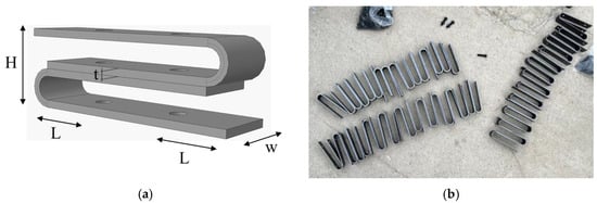 S-shaped steel dampers: geometric properties (a) and prototypes produced (b).