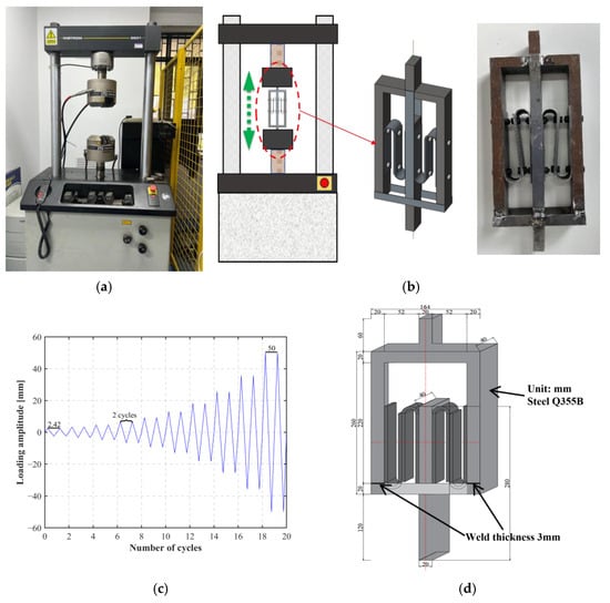 The testing machine implemented is an Instron 8801 (Figure 4a). A transmission device was designed and produced in order to adapt the geometric part of the S-shaped steel dampers to the testing machine (Figure 4b). Quasi-static cyclic shear tests were performed at a speed of 0.1 mm/s. In particular, the dampers were subjected to cyclic horizontal displacements, starting with an amplitude of 2.42 mm up to a final amplitude of 50 mm (Figure 4c) based on FEMA 461 [37]. For each amplitude, two cycles were performed. The results were evaluated in terms of horizontal stiffness and damping ratio according to Equations (1)–(3) (for further details, the reader is referred to [38]):