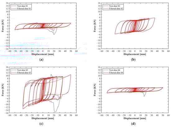 The resulting displacement versus horizontal force curves are shown in Figure 5. Due to the unavoidable intrinsic geometric limitations of the transmission device, during some tests, contact occurred between the bolts of the steel dampers. This issue pertains specifically to the transmission device used in this uniaxial tensile test and does not occur when these devices are implemented in seismic isolation systems. Therefore, it is not representative of the actual lateral behavior of the dampers. So, filtered data were produced post-processing in order to eliminate such imperfections in the final curve (Figure 5). The filtered curves were considered for the evaluation of both horizontal stiffness and the damping ratio.