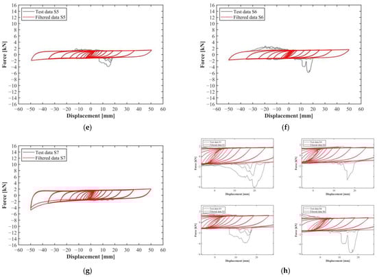 Experimental results obtained for the SSSDs in the cyclic tests: S1 (a), S2 (b), S3 (c), S4 (d), S5 (e), S6 (f), S7 (g), and zoomed details of S1, S4, S5, and S6 (h).