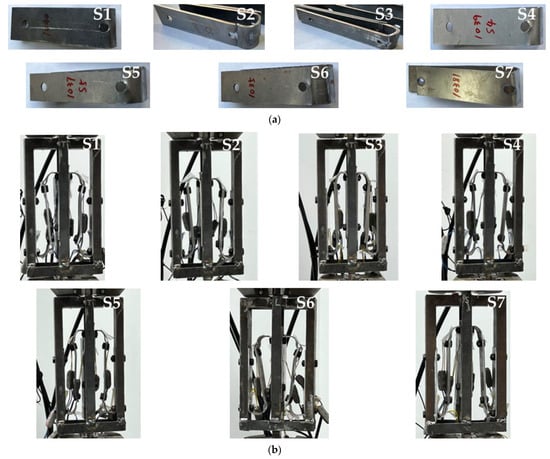 As for the distance between the bolt hole and the beginning of the arc, specimen S7, which had the smallest L, exhibited both higher horizontal stiffness and a higher damping ratio. Notably, S7 showed an abnormal increase in the damping ratio compared to other specimens, whose values averaged approximately 0.40 ± 5%. Specifically, S7 recorded a damping ratio of 0.44, characterized by asymmetric and unstable hysteretic behavior in both positive and negative directions of the force–displacement curve, as shown in Figure 5g. This behavior is attributed to the deformation of the bolt holes. In fact, the reduced distance between the hole and the arc increases sensitivity to deformation. This phenomenon is even more clear in Figure 6, which highlights the damages observed after testing (Figure 6a) and the deformations at maximum shear strain (Figure 6b) for all the specimens. Specimen S7 exhibited significant deformation around the bolt hole and arc end regions. Conversely, specimen S6, with a larger distance L, showed minimal deformation of the holes. Specimens S2 and S3, which featured greater thickness, experienced a stiffer deformation and a brittle failure, with the dampers fracturing during the 18th and 19th loading cycles. In the end, specimens S4 and S5, which featured increased width, exhibited post-test behavior similar to that of specimens S1 and S6, with only minor deformation of the bolt holes. This consistency was also observed in their deformation at maximum displacement.