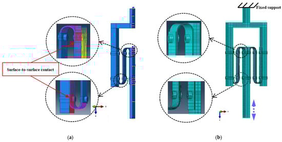 The experimental cyclic shear tests were modeled and analyzed numerically. In particular, steel damper specimens and transmission devices were modeled in Abaqus [39]. According to the symmetric condition of the steel damper, only one-half of the device, including one S-shaped steel damper and transmission part, was modeled to reduce the computational cost.