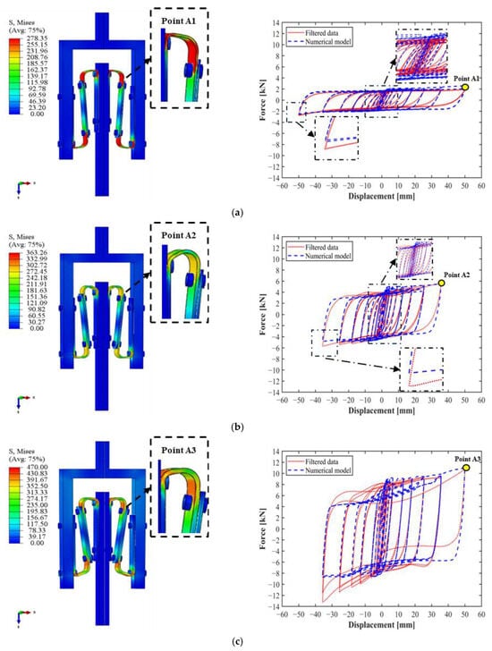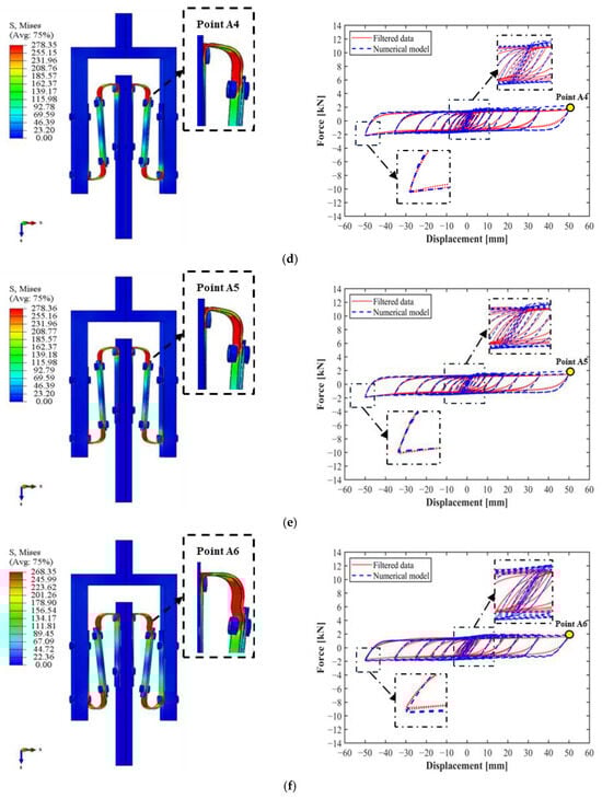 The deformation and stress distributions of the steel dampers at the maximum displacement during testing (Points A1–A7), as shown in Figure 8, highlight the capability of the numerical model to accurately replicate the actual behavior of the steel dampers, particularly in capturing stress concentrations around the bolt holes and arc regions. Specimens S2 and S3 exhibited higher stress levels due to their stiffer response, while specimen S7 displayed noticeable stress in the arc, emphasizing its increased sensitivity caused by the small distance L. In contrast, specimens S1, S4, S5, and S6 showed very similar deformation patterns and stress distributions, aligning closely with the experimental results.