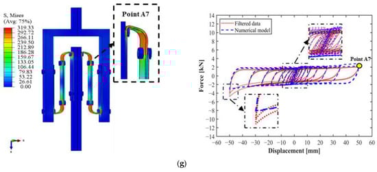 Comparison between numerical and experimental cyclic curves and FE deformation and stress distribution at maximum displacement: S1 (a), S2 (b), S3 (c), S4 (d), S5 (e), S6 (f), and S7 (g).