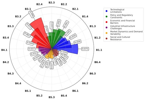 The BWM was applied to determine the relative importance of the sub-barriers within each main barrier category. The process involved nine experts identifying the most and least significant sub-barriers in each category and constructing Best-to-Others and Others-to-Worst preference vectors. The optimization ensured all consistency indices () were below 0.08, demonstrating robust and consistent weighting across experts. Table A1, Table A2, Table A3, Table A4, Table A5 and Table A6 present the detailed results. Final weights of sub-barriers were calculated by multiplying the weights of the sub-barriers by the respective weights of their main barriers. Figure 1 illustrates the relative importance of sub-barriers grouped by their main categories, providing granular insights into the specific challenges within the broader barrier framework.