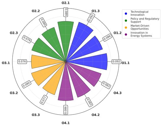 The prioritization of sub-opportunities was similarly evaluated using the BWM. Sub-opportunities within each main category were rated to derive their weights, ensuring consistency and robustness through the optimization process. All consistency indices remained below 0.08, indicating high reliability (see Table A7, Table A8, Table A9 and Table A10). The final weights of sub-opportunities were calculated by multiplying the weights of the sub-opportunities by the respective weights of their main opportunities. Figure 2 visualizes the prioritization of sub-opportunities, providing actionable insights into the prioritization of technological, policy, market, and energy system innovations to support carbon neutrality.