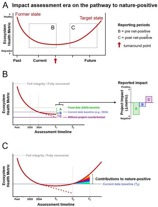 Impact assessment relationships with the pathway to nature-positive. The red arrow marks the turn-around point in a historical degradation trend (A). The choice of a fixed-date baseline (e.g., 2020), current-date baseline (e.g., 2024), or without-project counterfactual markedly influences the reported project impacts (B). Generalized case of applying the current-date baseline to all assessment contexts in the post net-positive era (C). Here the positive impacts of the project are assessed at T2 for expected gains at T3, and similarly for each subsequent reporting period (T3–T4 etc).