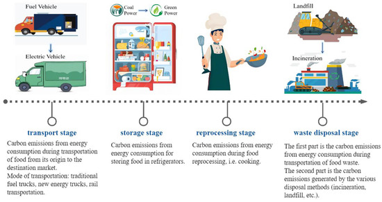 The lifecycle of food consumption typically includes four key stages: transportation, storage, reprocessing, and waste disposal. This study develops scenarios for each stage, drawing on relevant policies related to energy transformation and resource recycling in various cities.