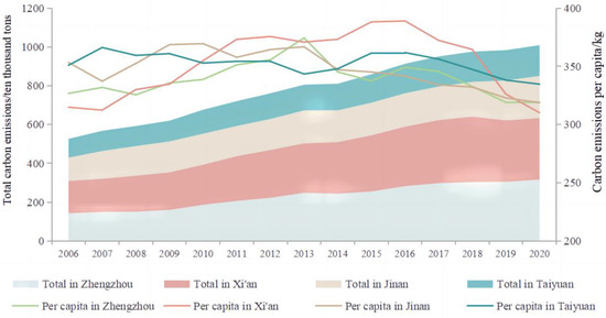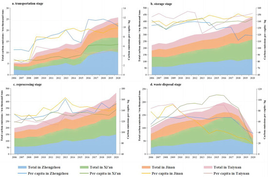 Based on the calculation method for carbon emissions at each stage, the total and per capita carbon emissions at each stage in the four cities were calculated, as shown in Figure 3.
