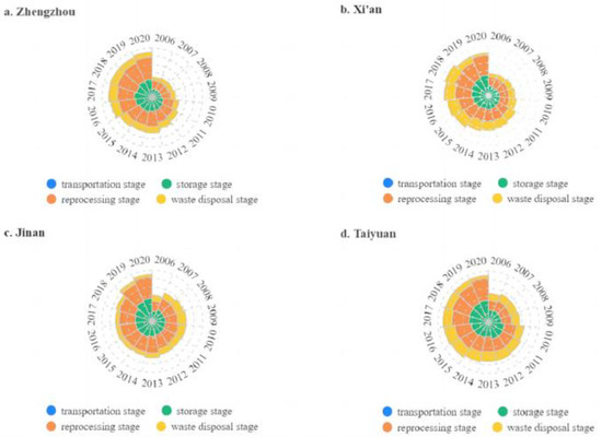 Total carbon emissions during the waste disposal stage initially increased before decreasing, with the overall order being Xi’an > Zhengzhou > Taiyuan > Jinan (Figure 3d). The focus here is on per capita waste disposal carbon emissions. From 2006 to 2009, Taiyuan had the highest per capita carbon emissions, primarily due to the high proportion of kitchen waste and the greater distance between its waste treatment stations and the city center, resulting in higher transportation emissions. From 2010 to 2019, the order generally shifted to Xi’an > Taiyuan > Zhengzhou > Jinan. Jinan’s per capita carbon emissions peaked in 2009 and then steadily declined each year. This was largely because, from 2010 to 2015, the growth of kitchen waste in Jinan slowed, and the city began implementing waste-to-energy incineration technology in 2011, which helped reduce carbon emissions. After 2016, while the amount of kitchen waste produced in Jinan began to grow rapidly, the city’s waste-to-energy incineration technology had already matured, leading to a continued decrease in overall carbon emissions. In contrast, Xi’an’s kitchen waste increased rapidly, reaching the highest volume, and its waste-to-energy incineration began later. As a result, per capita carbon emissions increased year by year until 2017. However, after adopting more advanced combined heat and power incineration technology in 2017, Xi’an saw a significant reduction in emissions, with a steeper decline compared to the other cities. Taiyuan, which began experimenting with waste-to-energy incineration in 2008, was one of the first cities to use this technology. However, due to outdated early technology and a high proportion of kitchen waste, per capita carbon emissions continued to rise until 2017. After power generation technology improved, emissions began to decline. Zhengzhou, which started waste-to-energy incineration later and lacked robust technical support, saw its per capita carbon emissions surpass those of the other cities by 2020.
