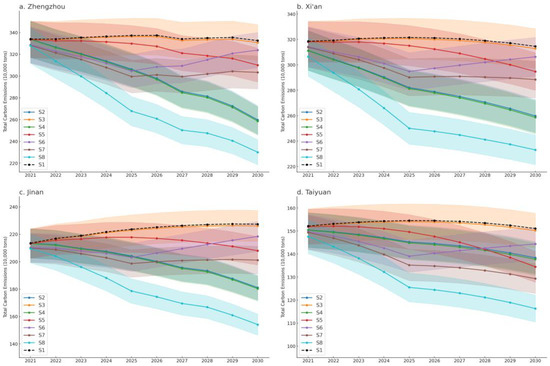 This study employs scenario analysis to predict urban food consumption carbon emissions for four provincial capital cities in the middle and lower reaches of the Yellow River from 2021 to 2030, as illustrated in Figure 5. In the baseline scenario (S1), confidence intervals are not included, as this scenario represents a stable projection derived from current trends, with relatively minimal uncertainties due to the absence of major assumptions or interventions. S1 serves as a reference scenario against which the effects of other interventions can be compared. For other scenarios (S2–S8), confidence intervals (±5%) are applied to account for uncertainties arising from variations in energy transitions, recycling transformations, and changes in food consumption behaviors. The shaded areas around the curves in Figure 5 provide visual representations of these confidence intervals, providing an estimate of the variability and reliability of the predictions under the given assumptions.
